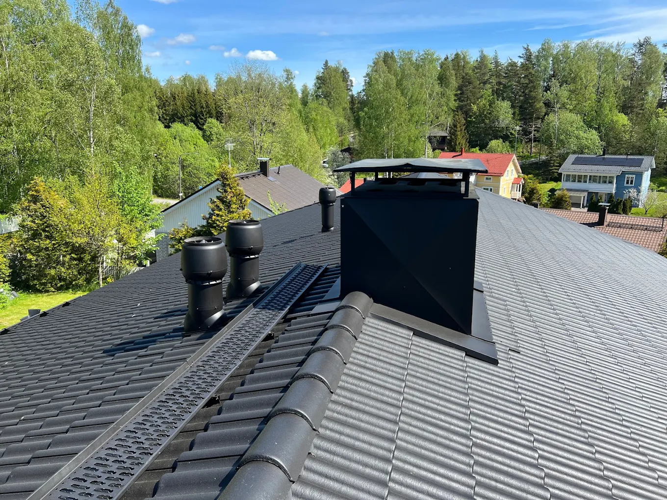 Pohjatyöt sisälsivät läpivientien tiivisyksen, kattojen huolellisen pesun korkepainepesurilla, kattojen sammaleenestokäsittelyn, rikkinäisten tiilten vaihdon, harjatiivisteiden asennuksen ja kattojen pinnoituksen kahteen kertaan.