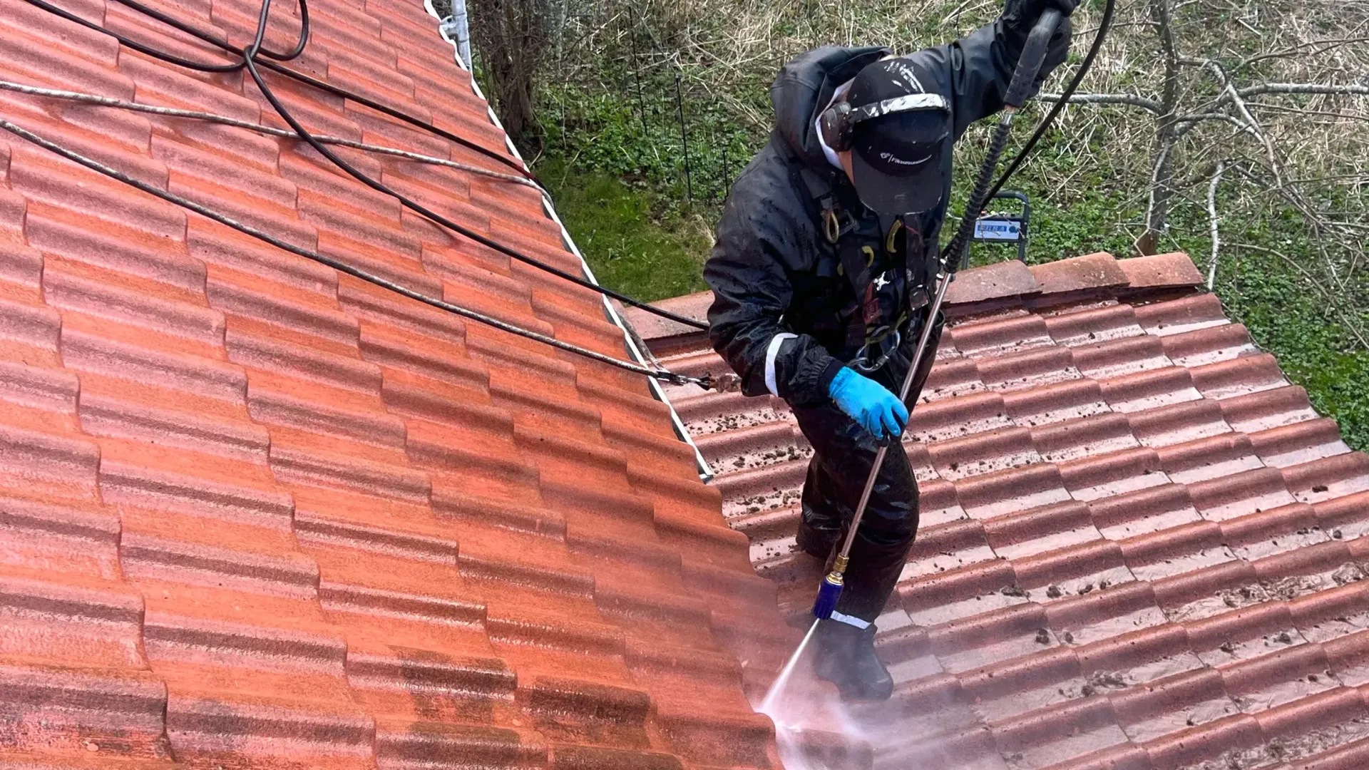 Katon pesu korkeapainepesurilla sammaleesta ja muusta kasvustosta.